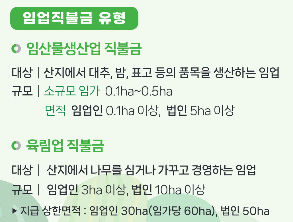 또한 국·공유림이나 산업단지, 이미 다른 직불금을 신청한 산지도 대상이 아니니 참고하세요.