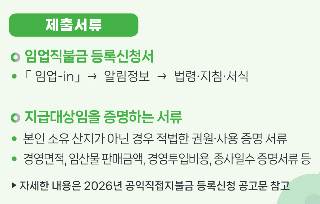 2. 지급대상 증명 서류: 임산물 판매 영수증, 종사 일수 증명서, 경영 투입 비용 증빙 등