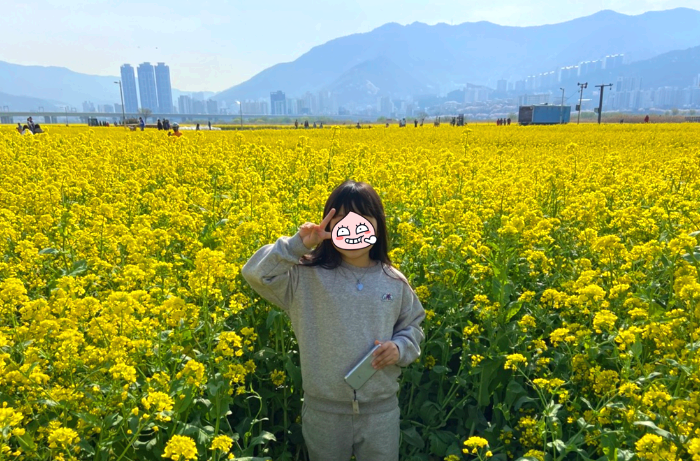 아 저거나 보러가자 했는데 왠걸 햇살아래 샛노란 유채꽃이 넓게 펼쳐진 모습이 너무 이쁘더라고요. 노란 꽃 사이사이 연인들 아이, 가족들이 인생 사진을 찍고 있더라고요, 이른 아침이라 사람들이 그렇게 많지는 않았지만 그래도 아침 치고는 사람들이 꽤 있었습니다.