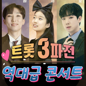 이 '트롯 3파전' 콘서트에서는 '미스터트롯' 톱 5까지 진출하며 '사랑시 고백구 행복동' 무대로 화제를 모았던 실력파 트로트 가수 최수호도 나와서 역대급 트롯3파전 콘서트를 보여줄 예정이라고 합니다. 트로트 신동 양지원, 최연소 감성괴물 빈예서의 활약도 기대됩니다.